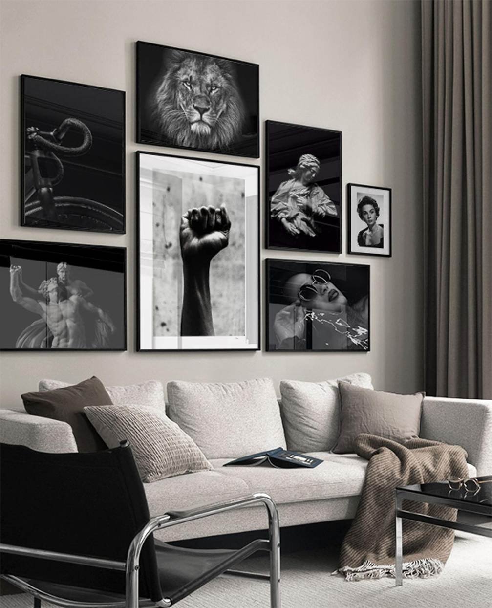 As molduras também impactam no estilo. Uma moldura preta simples remete ao moderno, enquanto uma moldura dourada pode trazer um toque clássico. Em ambientes mais descontraídos, molduras coloridas e diferentes podem criar um efeito divertido.